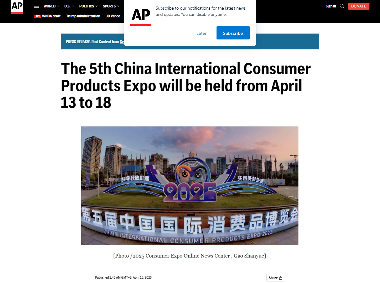 第五届中国国际消费品博览会(简称第五届消博会)于2025年4月13日至18日在海南举办,由商务部和海南省人民政府共同主办,主题为“共享开放机遇,共创美好生活”。通过世通社外媒传播渠道, 获得包括美联社、雅虎、商业内参、环球邮报、国家邮报在内的超500家外媒关注报道,博览会国际影响力得到进一步提升。
