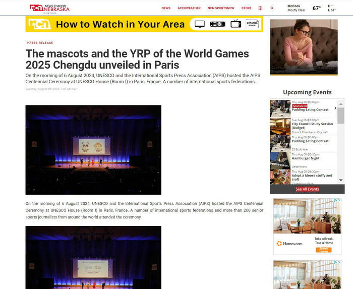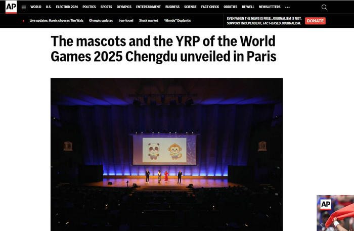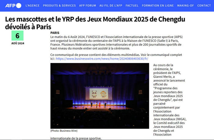 北京时间8月6日下午,正值巴黎奥运会举办期间,国际体育记者协会(AIPS)成立100周年巴黎纪念活动在联合国教科文组织巴黎总部举行。活动现场,成都世运会吉祥物首次亮相国际舞台。同时,AIPS主席吉亚尼·梅罗宣布,由国际世界运动会协会(IWGA)、成都世运会执委会和国际体育记者协会联合主办的“成都世运会青年记者计划”正式启动!